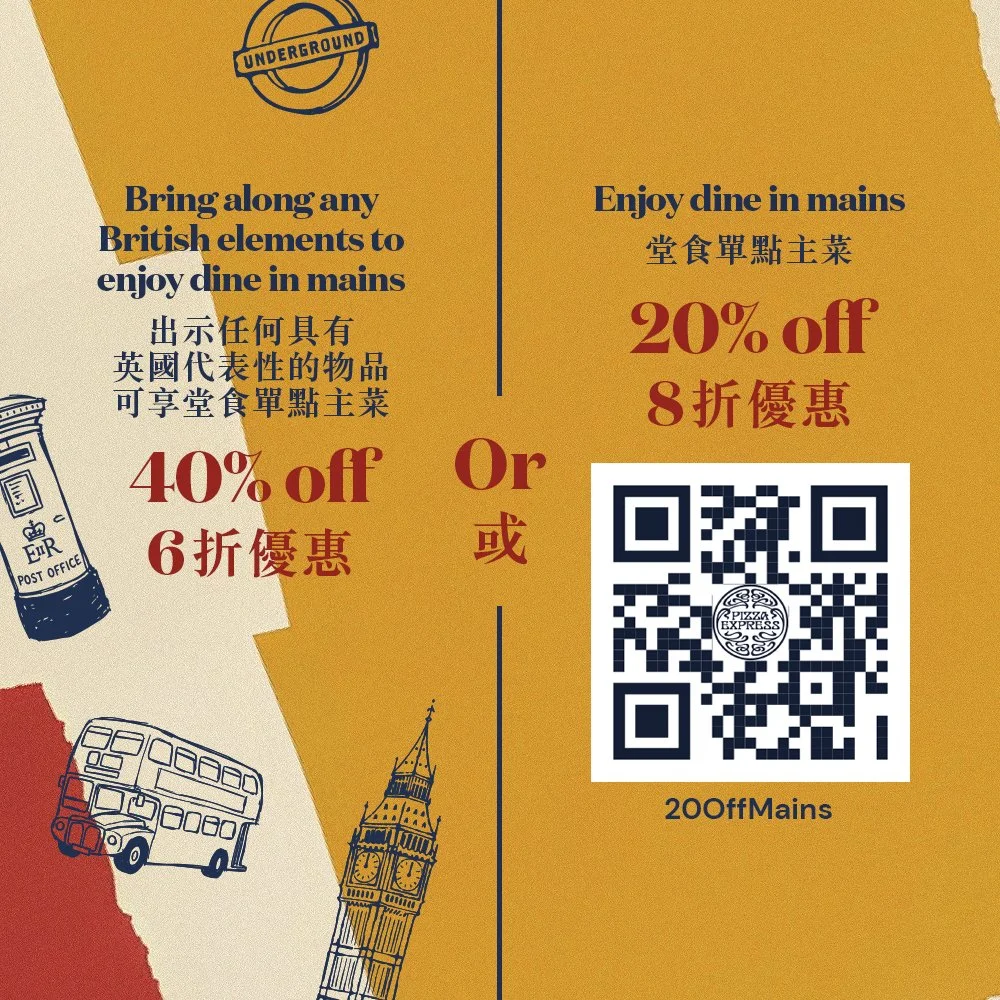 Join PizzaExpress Birthday celebration by bringing an item that reminds you of Britain to enjoy 40% off any dine-in mains; If not, present the offer QR code to the restaurant staff to enjoy 20% off on dine-in mains.